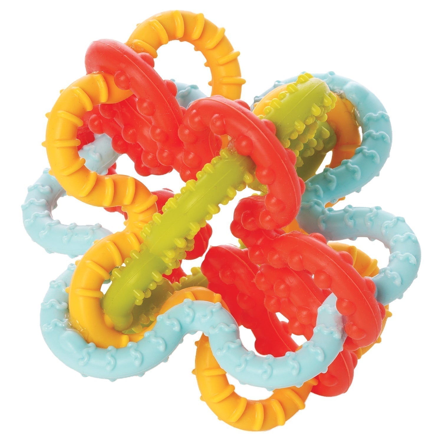 100% silicone, uniquely shaped and ready for sensory playtime! The Squiggle Loops Sensory Toy has all the makings of a textured teether, and brightly colored fidget toy combined. The flexible silicone loops make it easy to grasp, while the textured nubs add tactile play value. Its compact size makes it ideal for travel and easily attaches to baby links. Plus, it's dishwasher safe for easy cleaning! If you're in search of a toy that delivers on a sensory experience and textured teething exploration, look no further than the Squiggle Loops Sensory Toy.